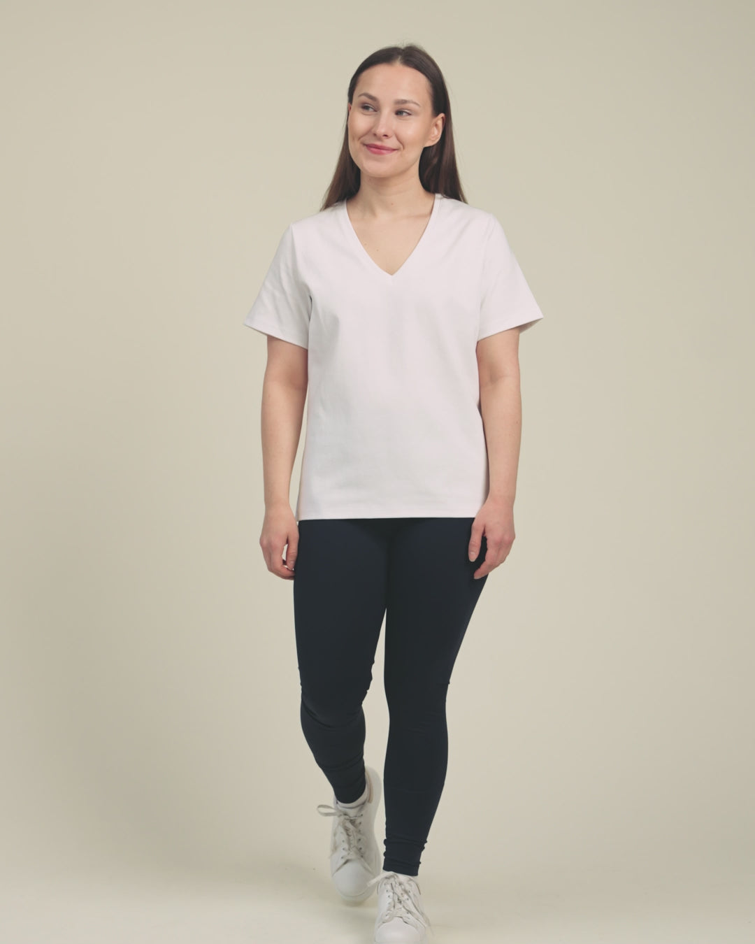 The perfect everyday t-shirt that is not see-through. The V-neck is flattering and relaxed, the material is soft and made of high-quality knit. The shade is pure white.